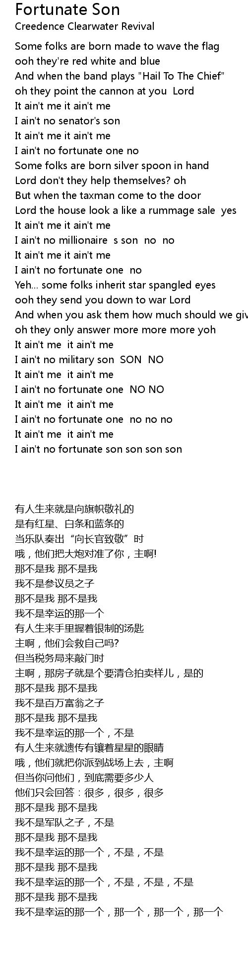 The Vietnam War.. Fortunate Son Lyrics are a subject that is being searched for and appreciated by netizens today. You can Download the Fortunate Son Lyrics here. Get all royalty-free images. Creedence Clearwater Revival-Fortunate Son Lyrics, READ THIS! If you have any ideas for the next lyric video of a song (doesn't have to be CCR) leave a comment with the song and .